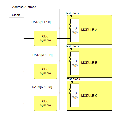 A few months ago I have came across an interesting implementation problem. Xilinx Vivado IDE has a curious optimization strategy. This occurs in a situation where each module of a design is in a different CDC (clock domain cross) zone. Sample diagram of such HDL design is here: